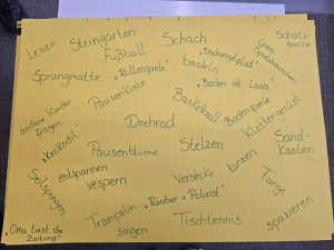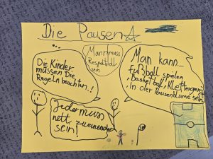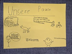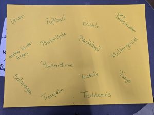 In einem Kurzprojekt haben sich die Kinder der Klasse 3a mit dem Thema Pause und Pausenspiele beschäftigt. In Kleingruppen wurden Plakate erstellt, welche Spielmöglichkeiten es in der Pause auf unserem Hof gibt. Anschließend stellte jede Gruppe ihr Plakat vor und zum Schluss wurden alle genannten Dinge auf einem Gemeinschaftsplakat gesammelt und im Klassenzimmer aufgehängt.